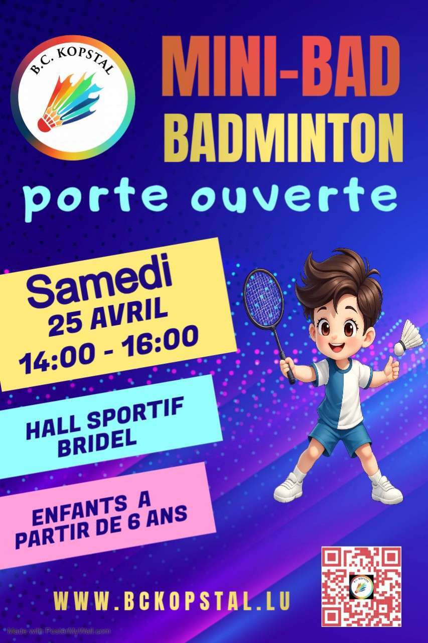 Le club organisera une porte ouverte « MINI-BAD » pour les jeunes à partir de 6 ans le samedi 25.04.2026 entre 14h00 et 16h00.
