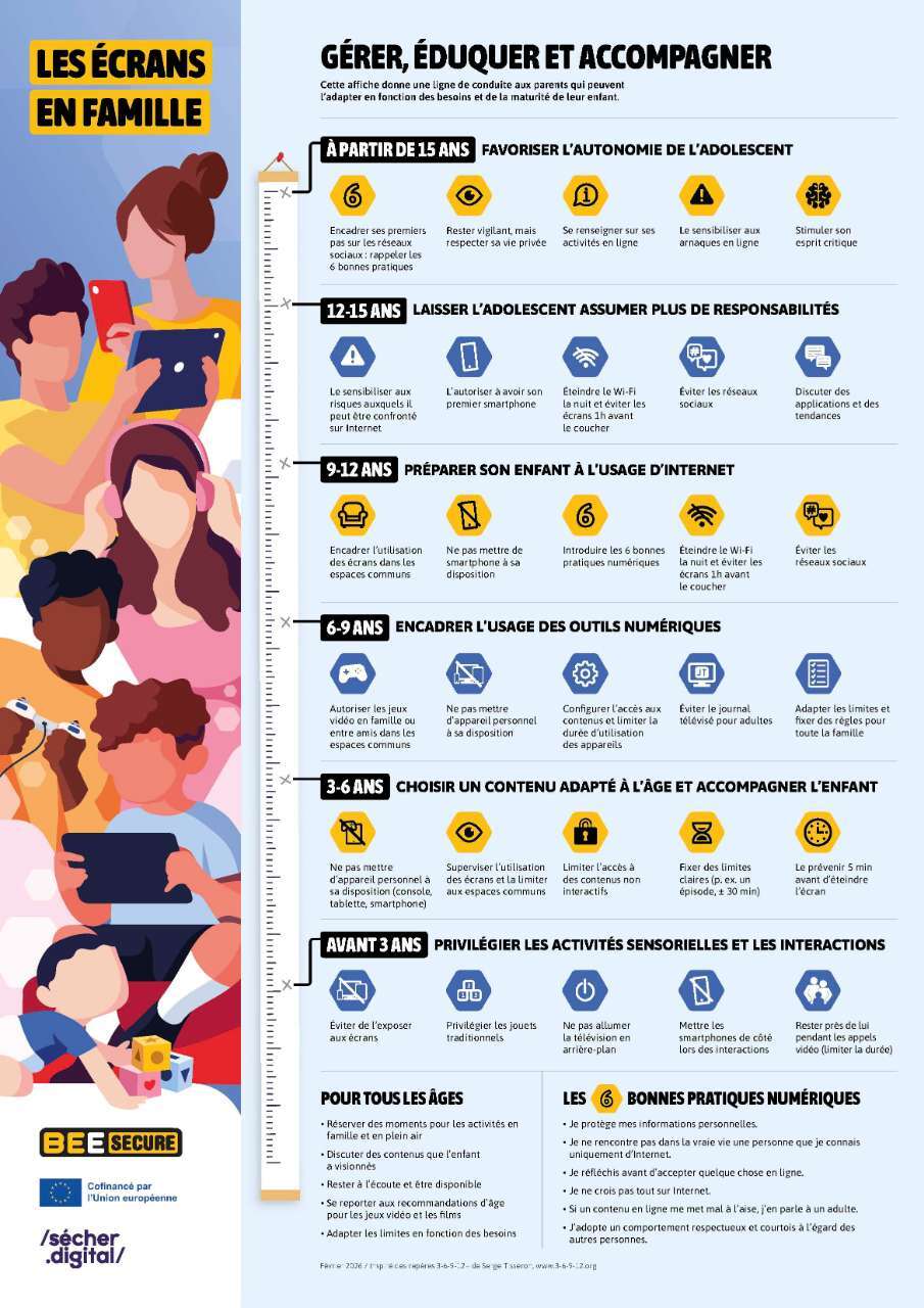 Cette affiche donne une ligne de conduite aux parents qui peuvent l’adapter en fonction des besoins et de la maturité de leur enfant.
