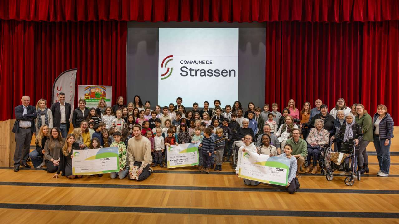 En présence de membres du Collège des bourgmestre et échevines, les enfants des Cycles 1, 3 et 4 de l’École fondamentale UNESCO de Strassen, accompagnés de leurs enseignants, ont remis, le 12 février 2026 des dons aux représentants des associations Sarah Grond, Pour une Parenthèse et Stëmm vun der Strooss.