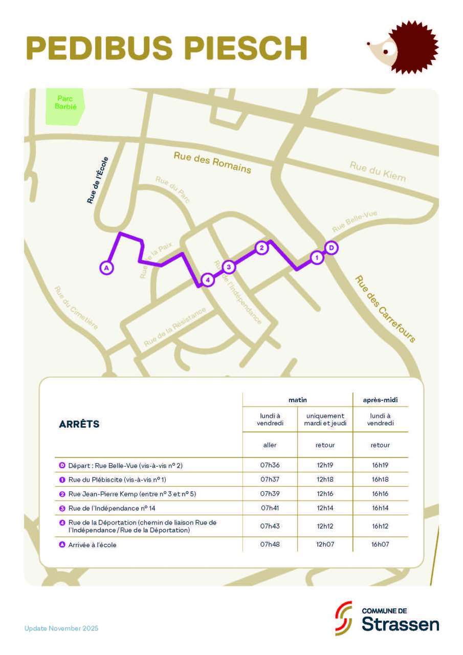Bien sûr, tous les enfants du quartier Piesch sont invités à utiliser le Pedibus pour se rendre directement à l’école de Strassen respectivement vers un arrêt du bus scolaire. Sur base de notre expérience de l’année scolaire écoulée, nous pouvons maintenant proposer ce service aux enfants à partir du cycle 1 précoce.